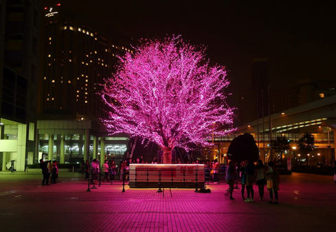 We set up "Arashi-zakura," a real 8-meter-long cherry blossom tree wrapped with about 20,000 LED illumination lighting, in the entrance plaza on the first floor of Fuji Television's headquarters in Odaiba.